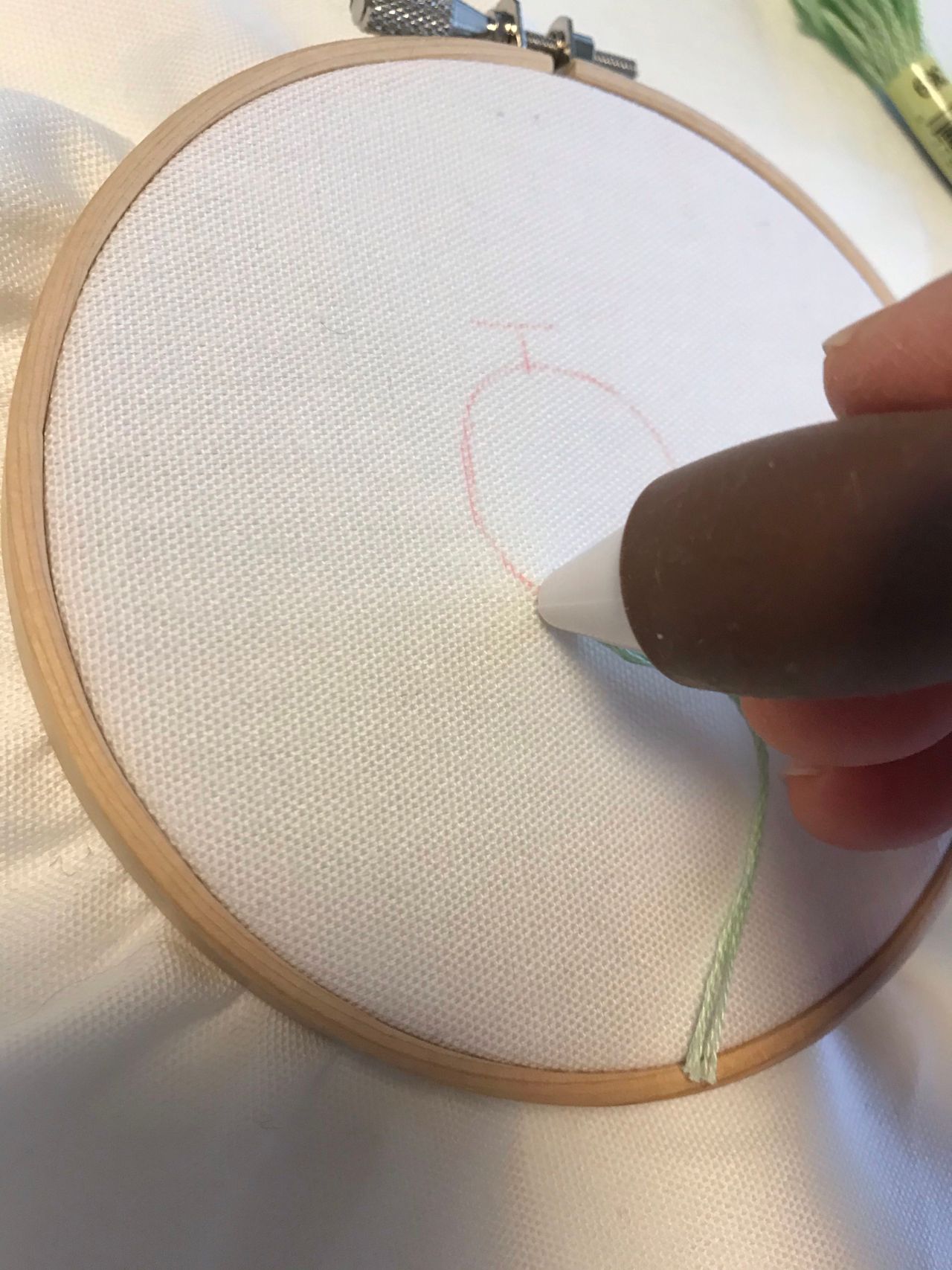 刺繍枠に布を張り、チャコペーパーなどで図案を写します。
