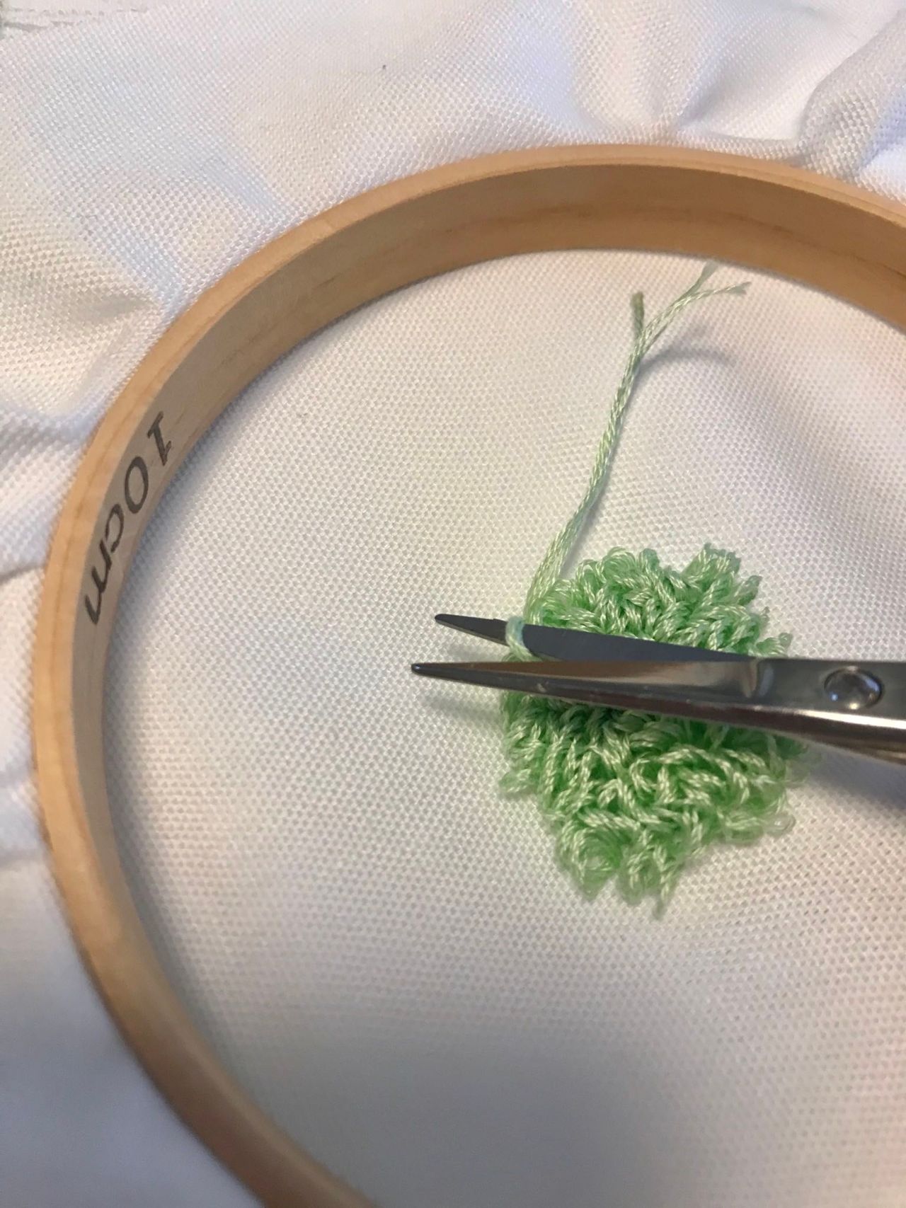 ⑦ ボンドが乾いてから、全てのループの輪をハサミで切り、毛足をならしながら形よく切りそろえます。