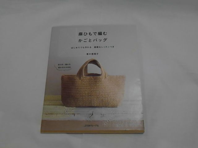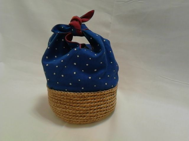 麻ひもで土台を編んで、麻生地で袋を作りました