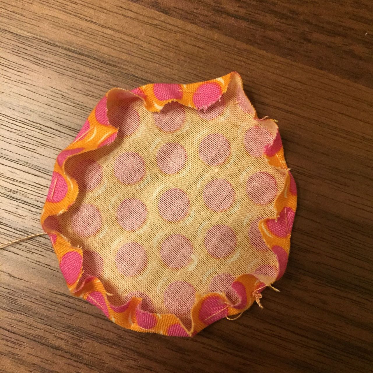 周りをちくちく縫って糸を引っ張るとお花の形になるんです!