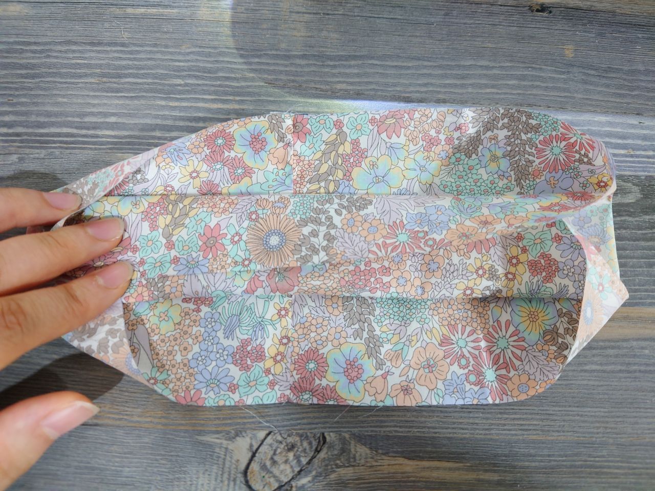 (3)の縫い目を山折りにし縫い目を端として、小・大それぞれの縫い代でぐるりと一周縫います