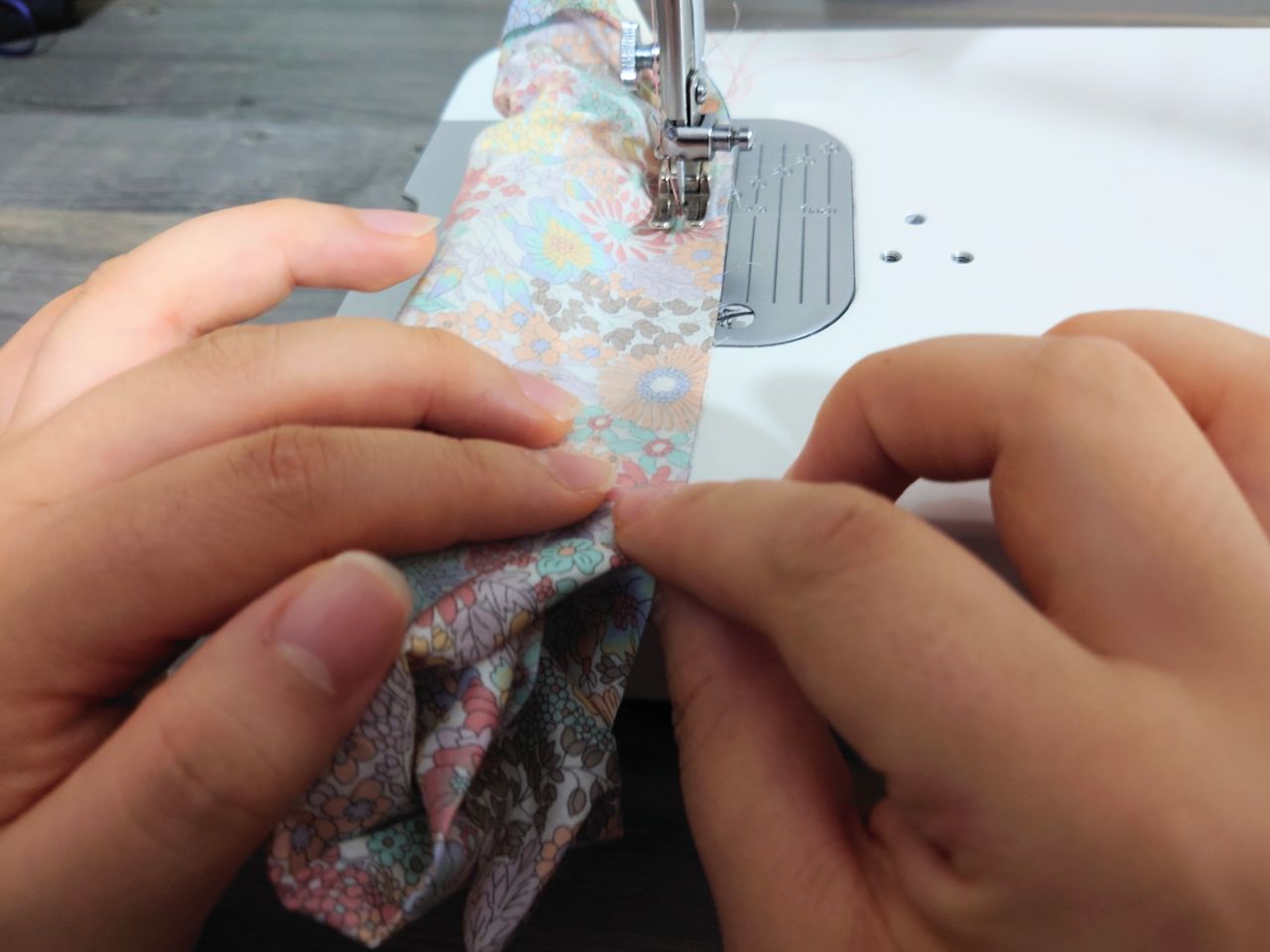 (1) 布を中表にし、両端を揃えて「輪っか」にし1cmの縫い代で縫います