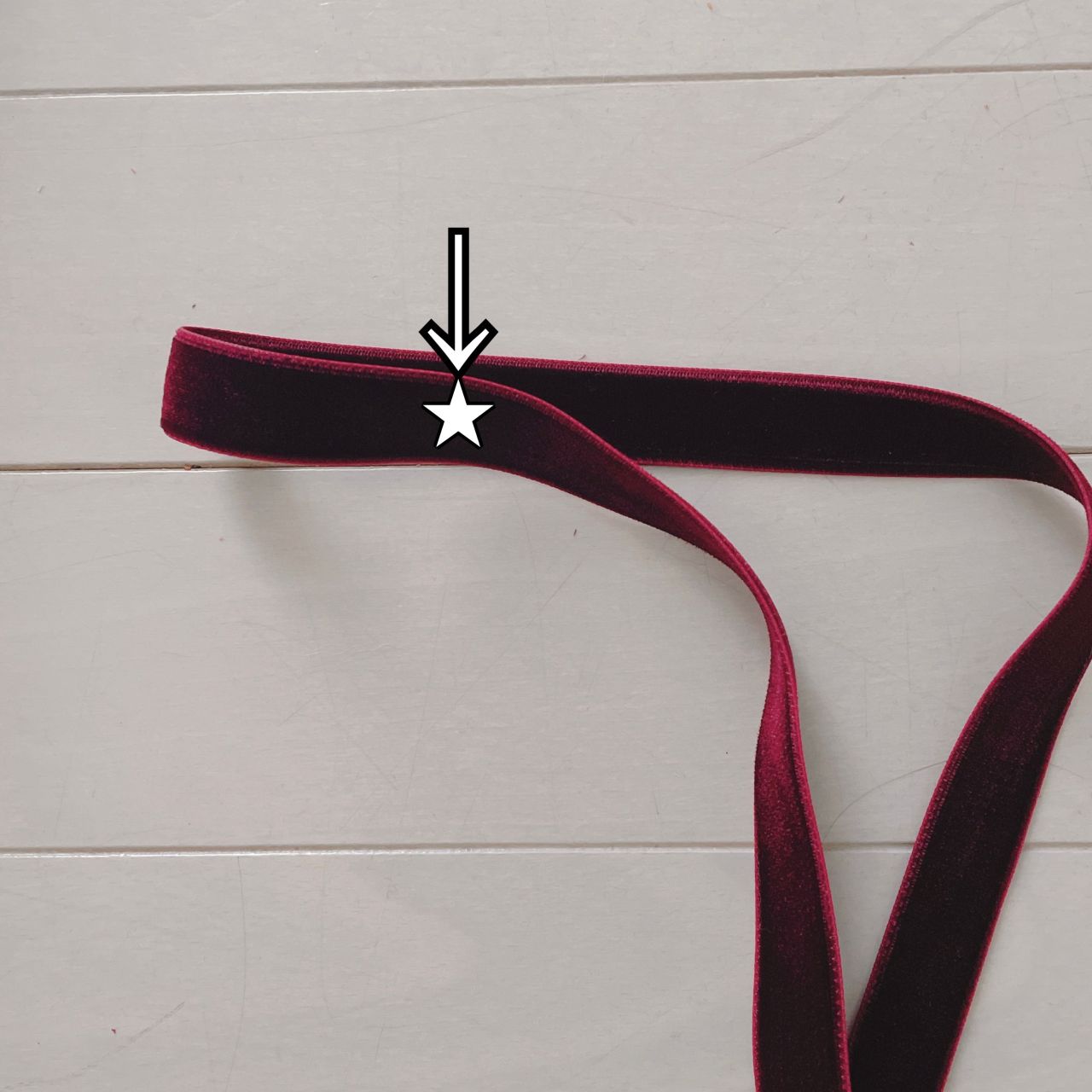 作っておいたリボンの真ん中の部分にくるっと巻きつけ、裁ほう上手を塗っておいたところをしっかりと押さえて圧着します。