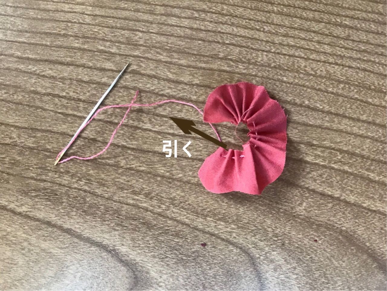 丸くなった生地をもう一周ぐし縫いして生地を固定する。