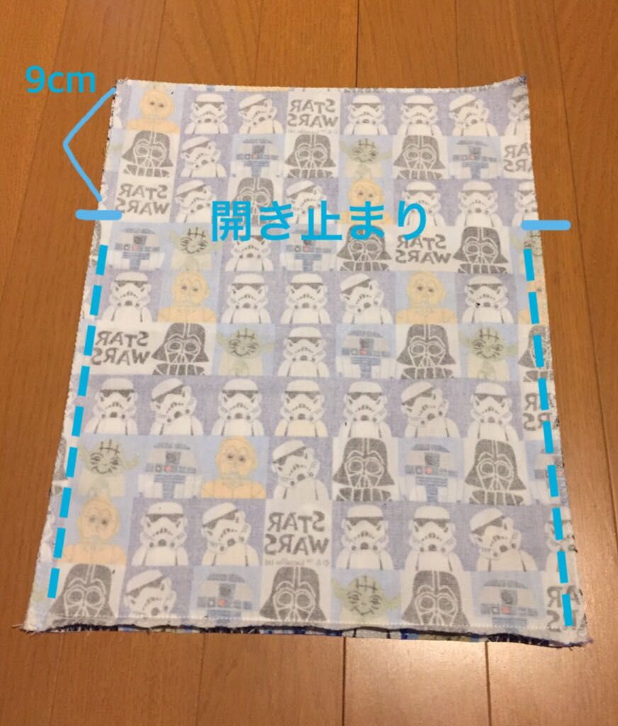 ③もう1度中表に合わせ、両脇を開き止まりまで縫い代1cmで縫います。縫い代はアイロンで割ります。