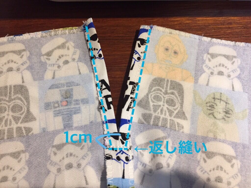 開き止まりの部分は1cm下を縫います。この時返し縫いをして丈夫に仕上げてください。