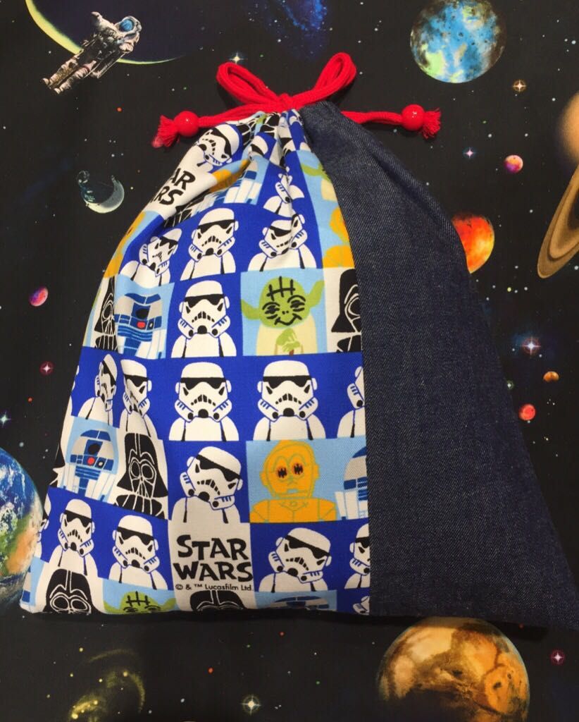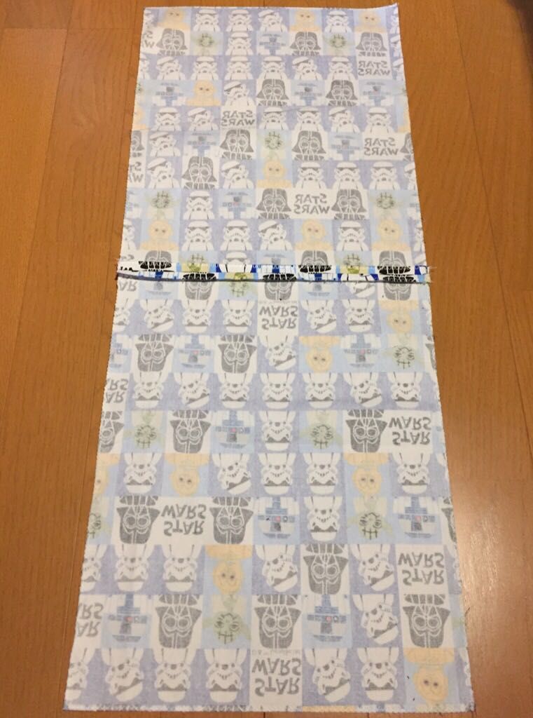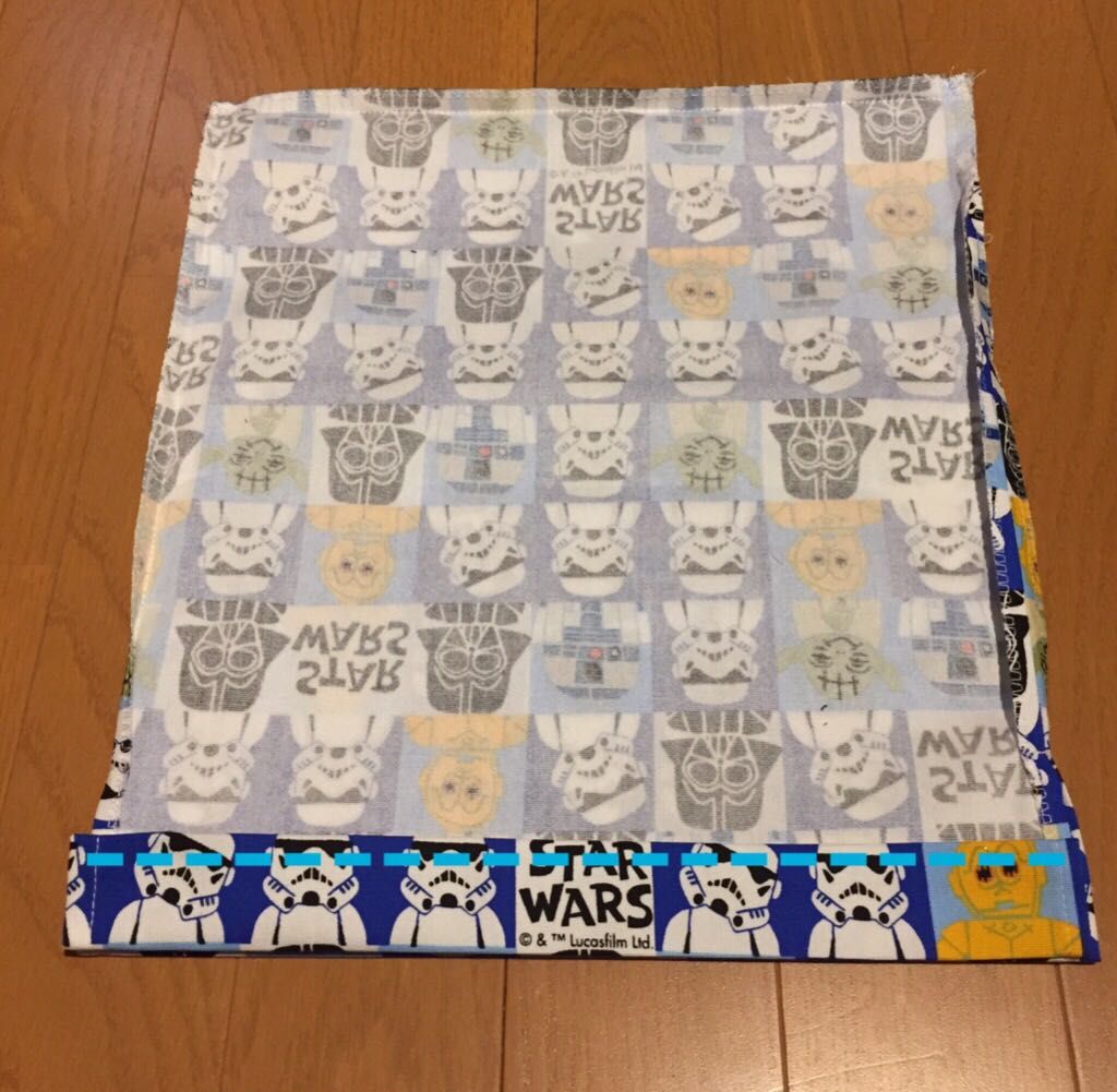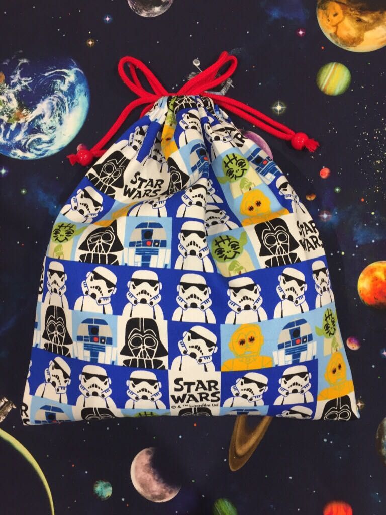 ⑥袋を表に返し、ひもを通します。(ダースベイダーのライトセーバーをイメージして赤いひもにしてみました(^^))