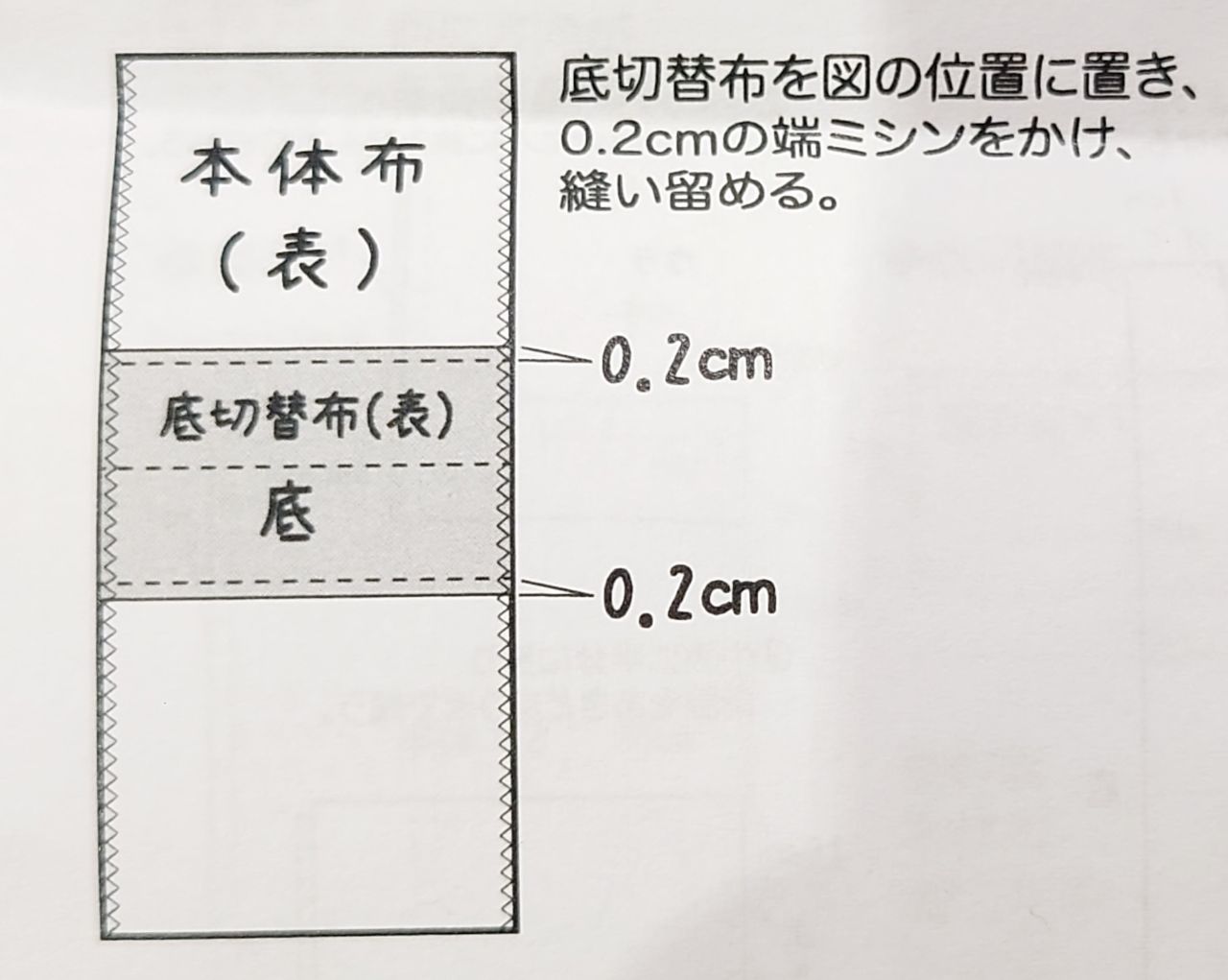 切り替え布を下図の位置に置き、0.2センチの端ミシンをかけ、切り替え布を縫い留める