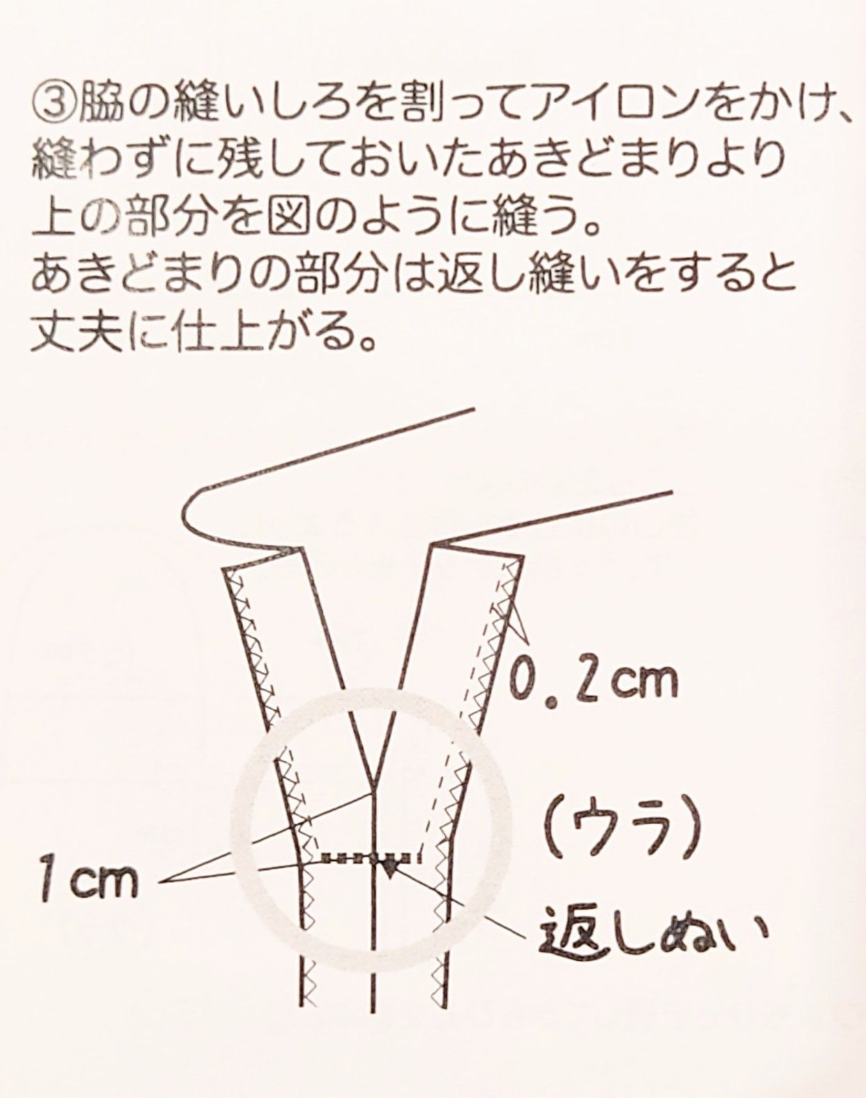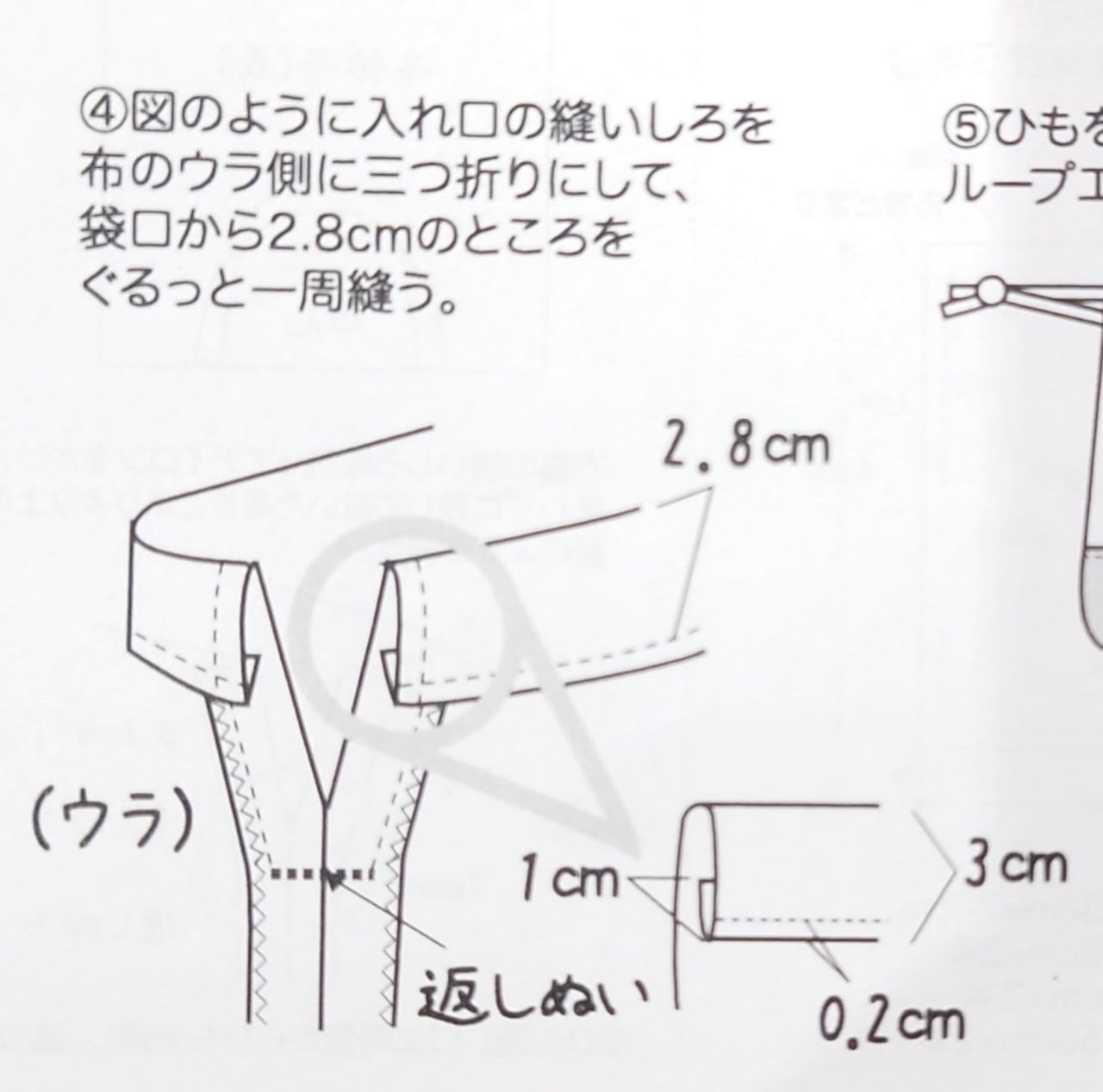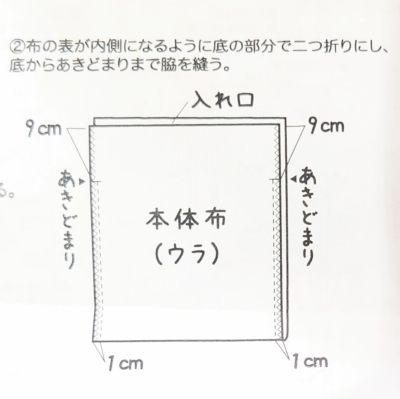 ④表布を中表で合わせ上から9センチ開き止まりまで両脇を縫う。縫い代は1センチ(下図参照)