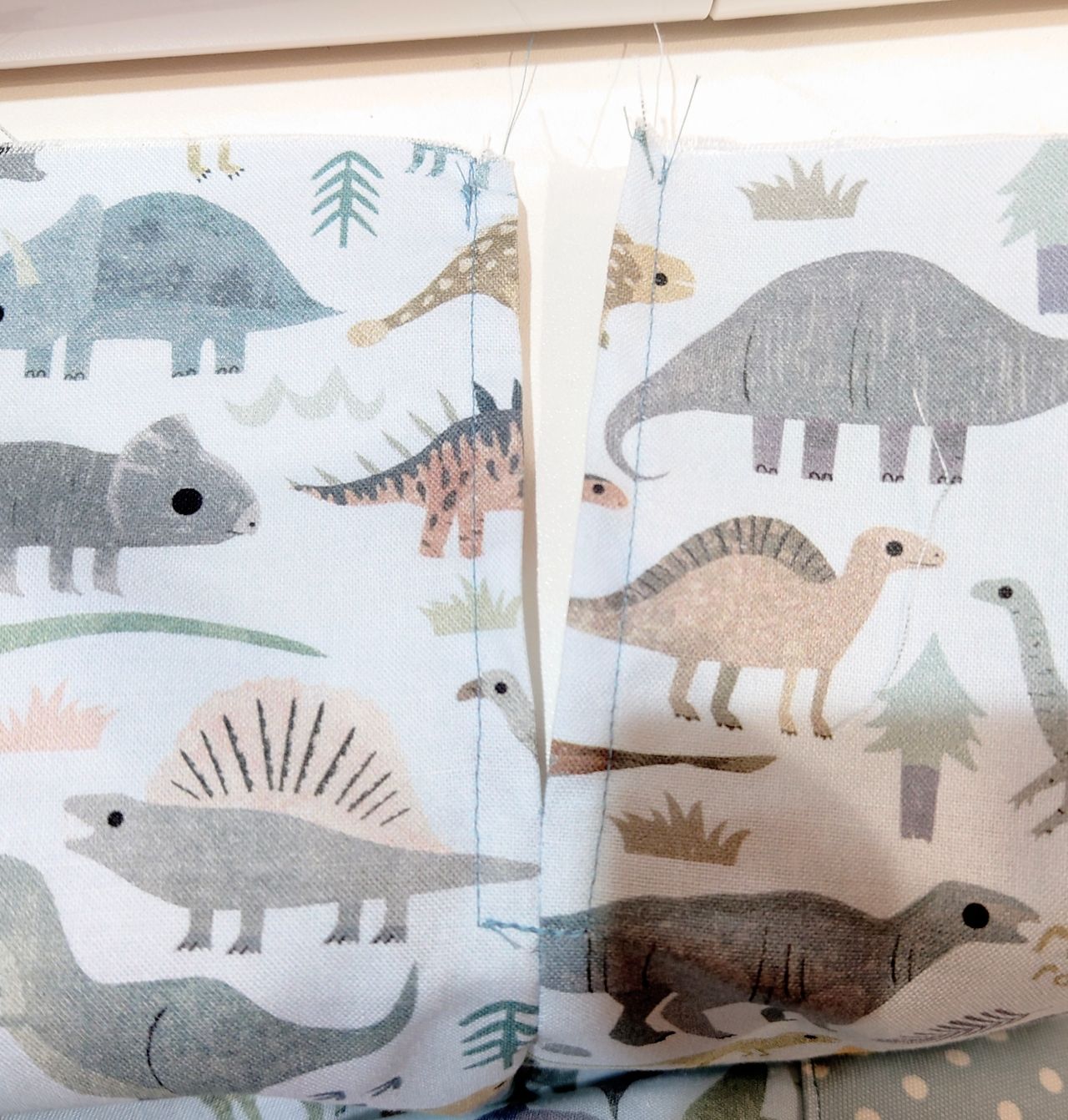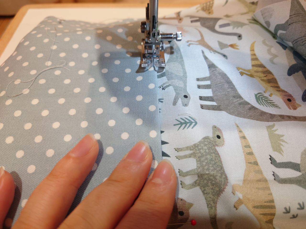 ②表布2枚を中表で合わせ、縫い代1センチで縫い合わせる。縫い代は割っておく
