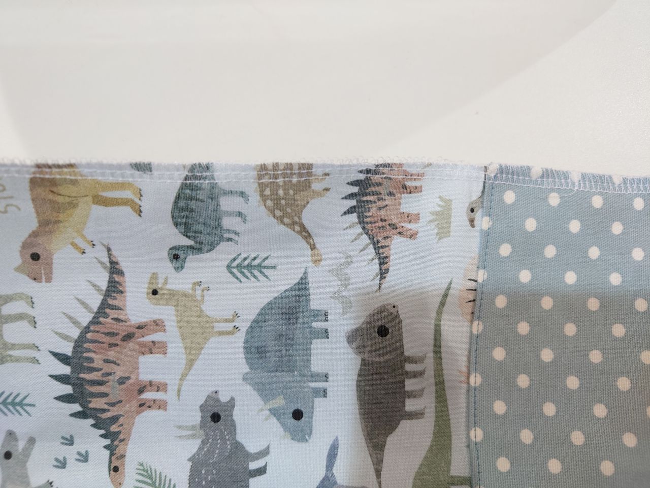 ①それぞれの表布の底部分をロックミシンまたは、裁ち目かがりミシンをかける