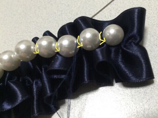 ⑤パールを完全に固定するために、リボンとパールとパールの隙間の糸を針と糸で縫っていきます。