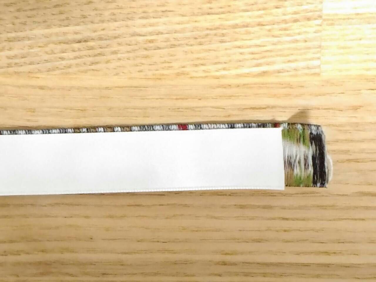 ②上の写真を参考にして柄リボンの両端を1㎝折り、無地のサテンリボンと外表に合わせてぐるっと一周ミシンをかけます。