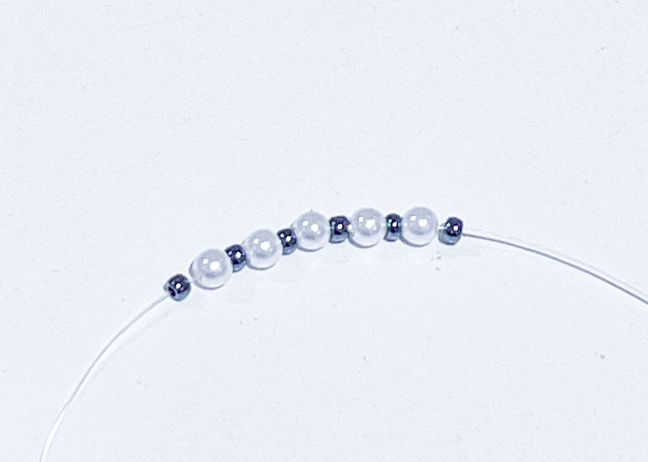 ①ビーズを好みの順番でテグスに通します。