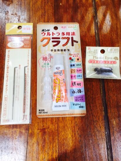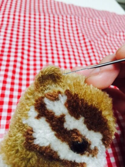 ③顔の形ができたら差し目をボンドで付け、耳をニードルで作ります。