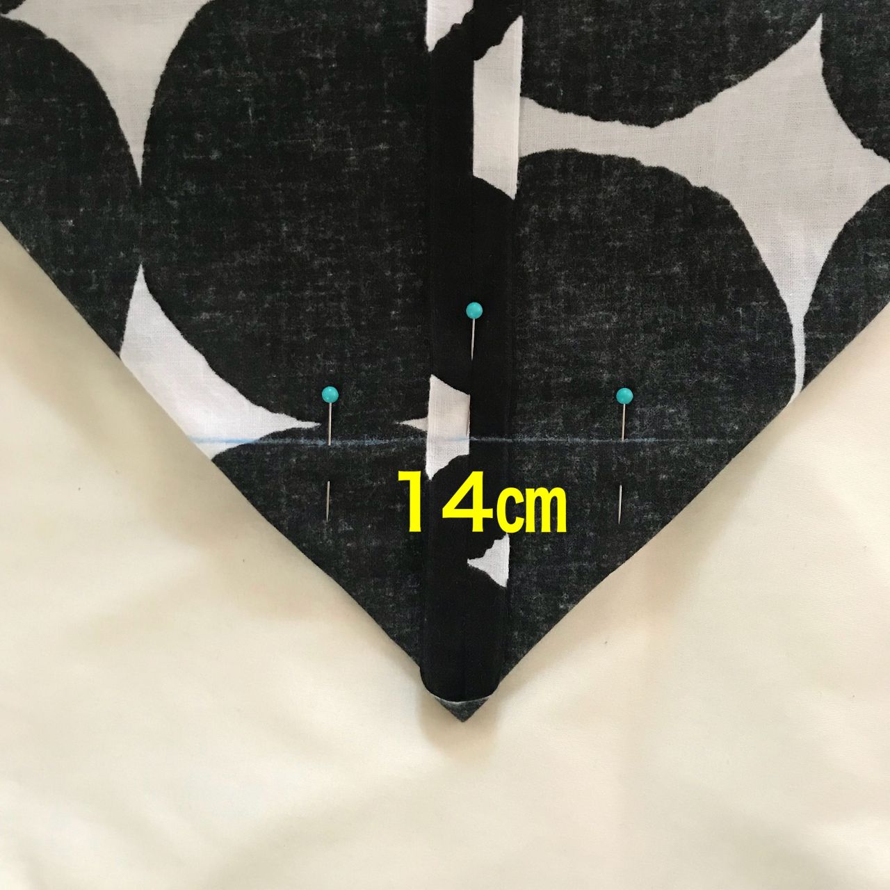 ②マチを縫います。下の端の角をたたみ、14㎝になるところを縫います。
