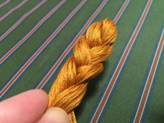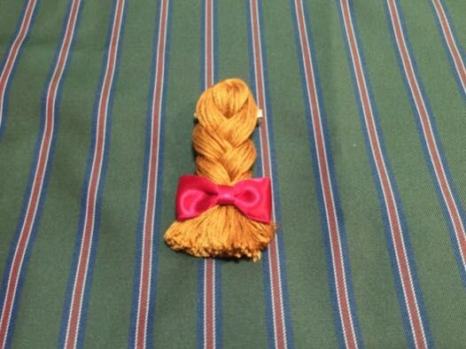 ⑤編み込んだところをもう1本の35cmの紐でくくり、三つ編みの表になる方に結び目が来るように