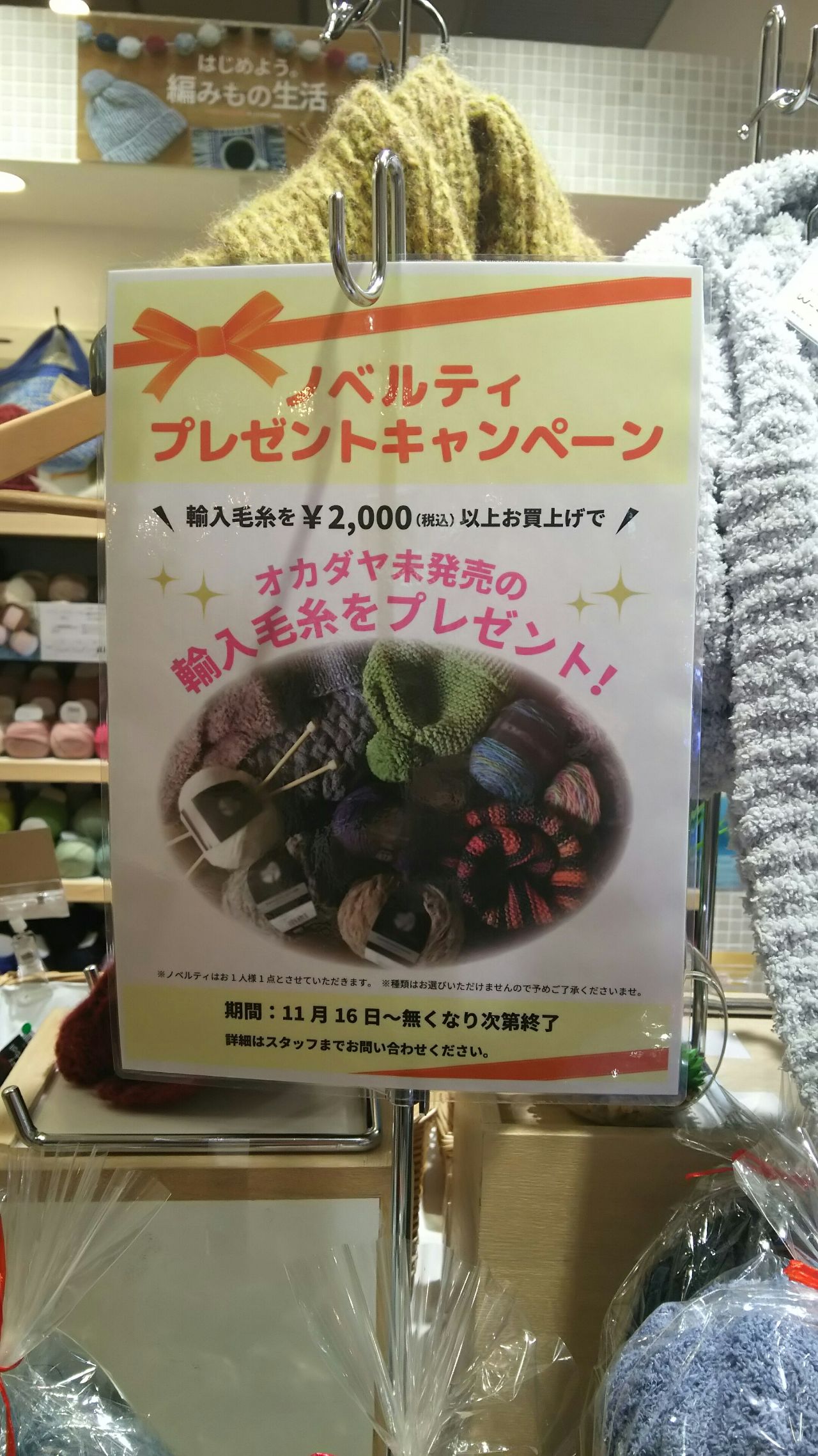 只今輸入毛糸を¥2000以上お買い上げの方に、オカダヤ未発売の輸入毛糸を1玉プレゼントしております(^^)
