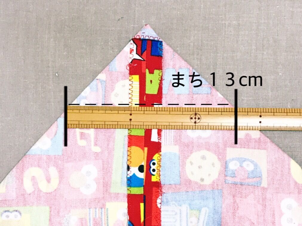 そこの両端の角の部分を、三角につぶしてまちを縫います。まち13cmのところを両方縫います。