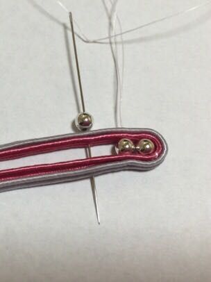 ソウタシェコード二本をズレないように、ビーズを入れながら縫っていきます。