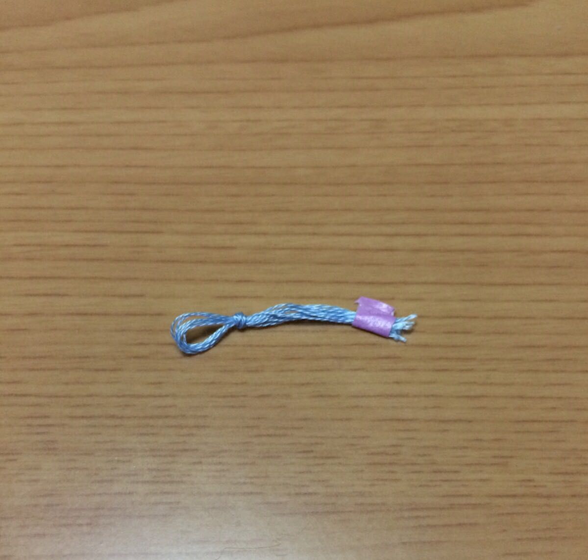 真ん中のヒモは約6㎝に切った刺しゅう糸を結んで作りました。結びやすいように先をマスキングテープで止めました。