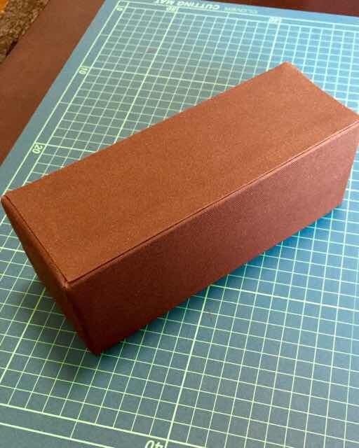 底の方に出た生地の角を落とし、本体に貼り付けます。同じように、上部にはみ出た生地も箱の内側に貼り付けます。