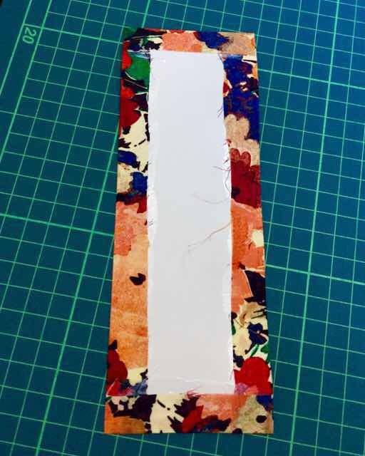 まずケント紙の方にボンドを塗り、ひとまわり大きく切った生地の裏側に貼ります。