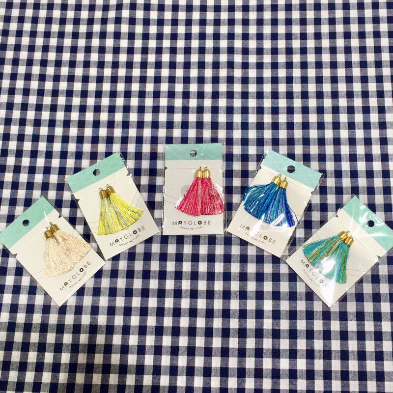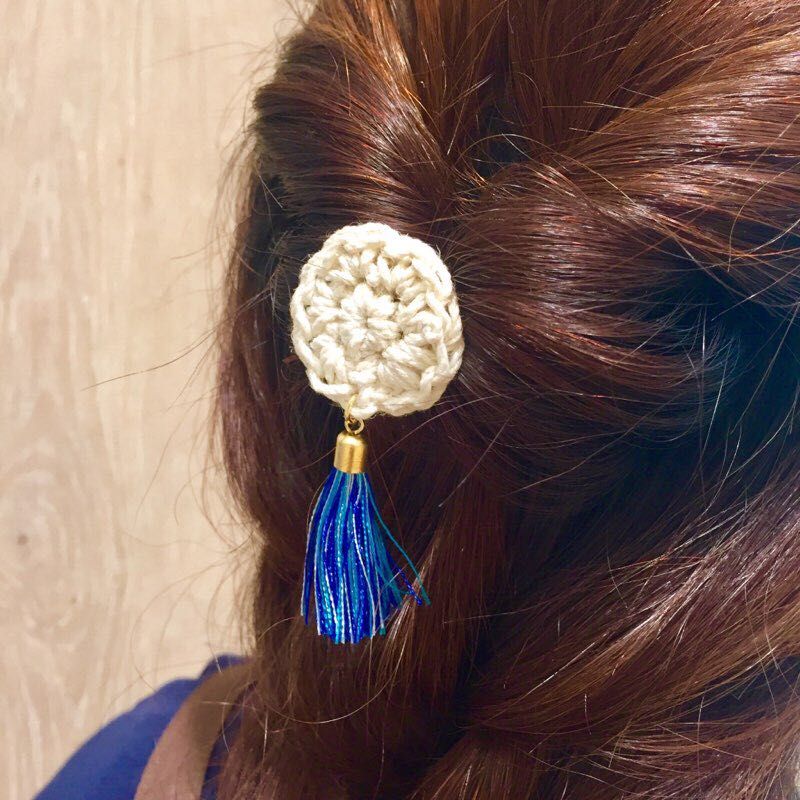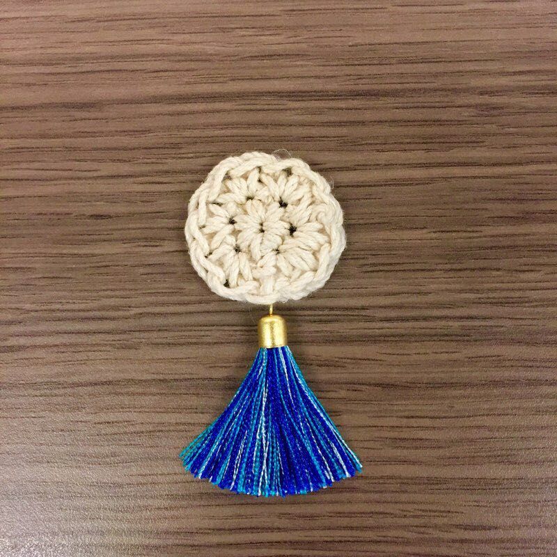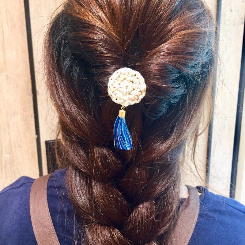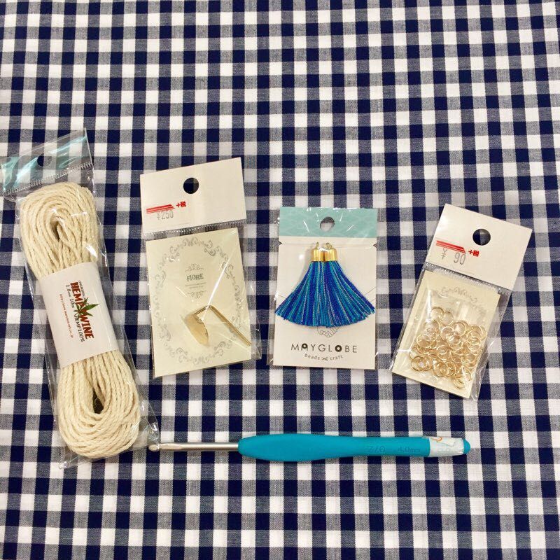 ②①で編んだヘンプ糸に丸カンでタッセルを付けます。