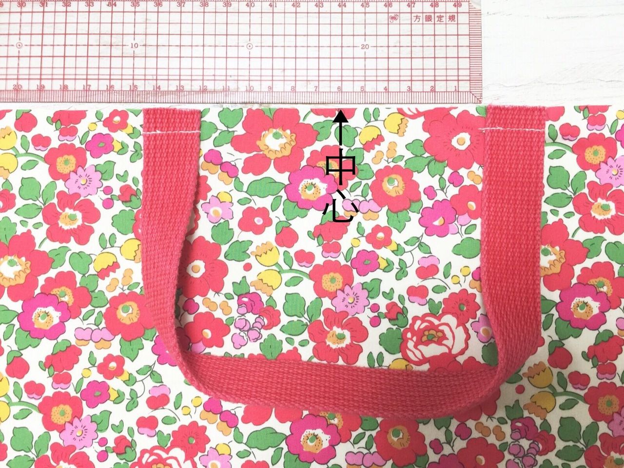 ⑥持ち手テープを中心から6㎝ずつ離れたところに仮止めします。