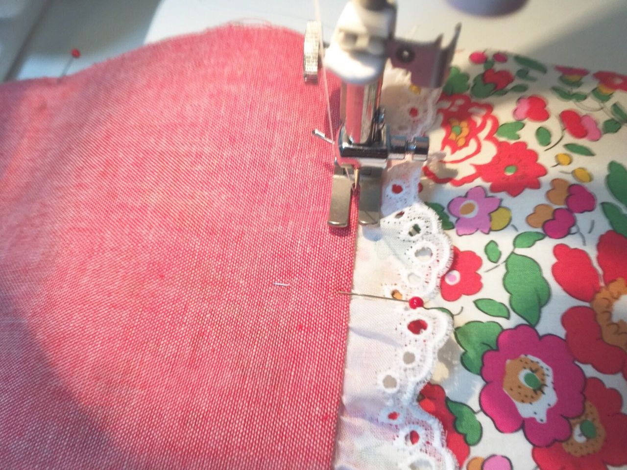レースの裏側が見えるように挟み込み、切り替え布の端2㎜くらいのところを縫います。