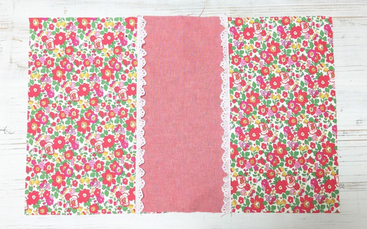 ④リバティと切り替え布の中心を合わせてマチ針でずれないように止めて、レースを挟んで縫う