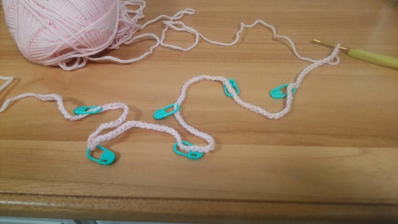 ピンクの糸でくさり137目の作り目をします。途中に段数マーカーを入れて数え間違えないように注意しました。