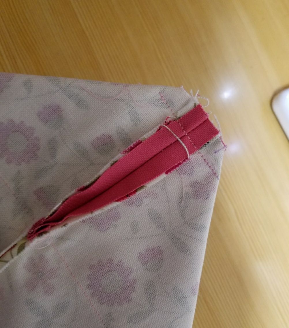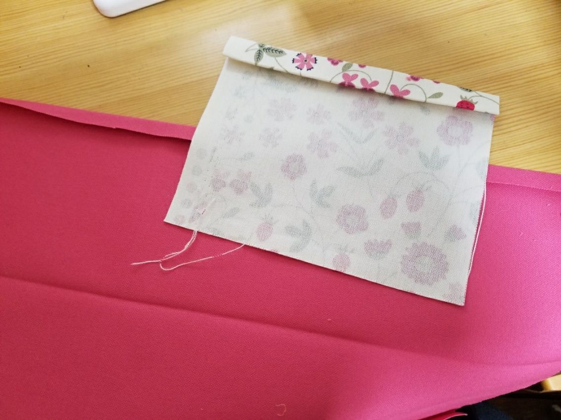 まずポケット口を1cm、1.5cmの三つ折りにしてアイロンをかけます。