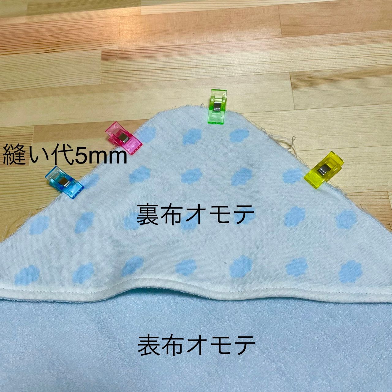 このとき本体の表布とフードの表布が中表になるようにします。(縫い代5mm)