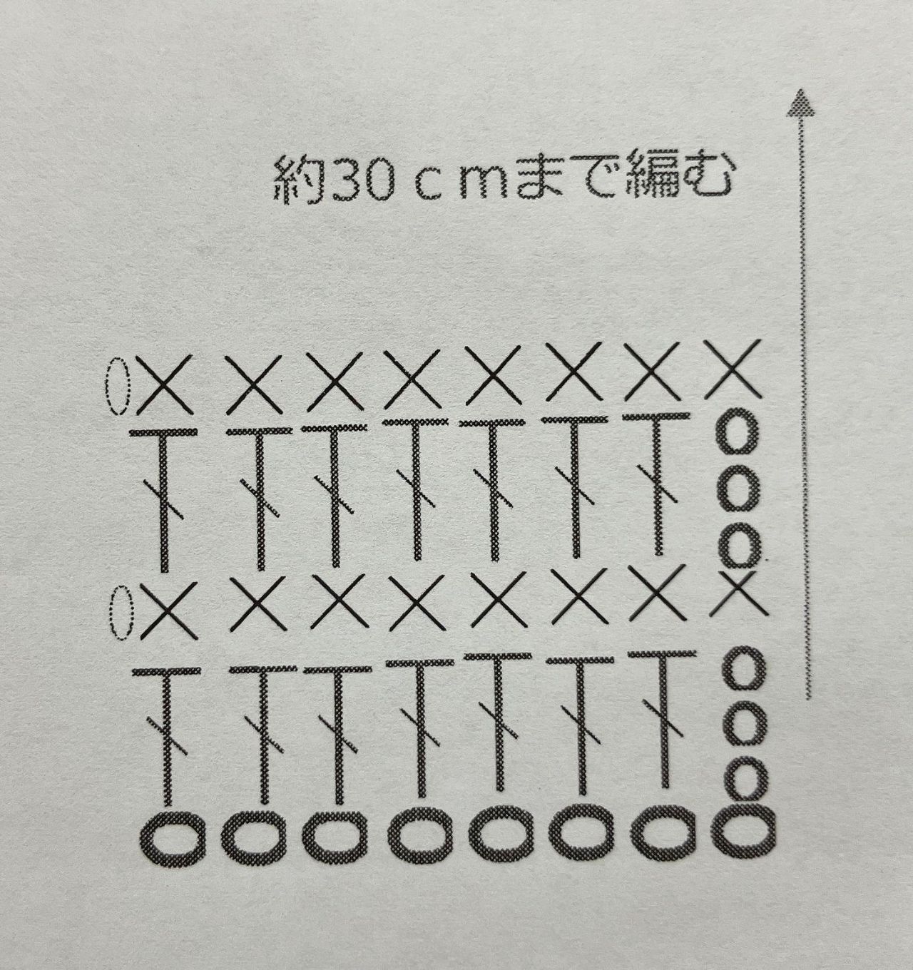 上記を繰り返し、30cmくらいの長さになるまで編む(長さはご自身の頭のサイズに合わせて下さい)