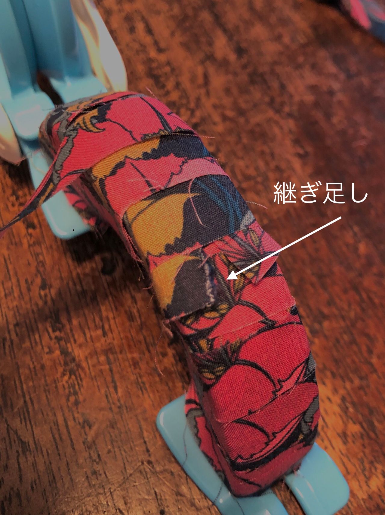 ※巻き始めと足す時は、外円側をカットし内円側を結ぶので、外円側に切れ端が来るようにします。