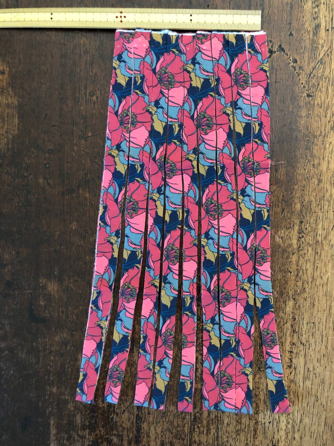 ①生地10cmを横地に1.5~2cm幅くらいに切り分けます。(長いと大変なので四つ折りくらいに折って切りました)