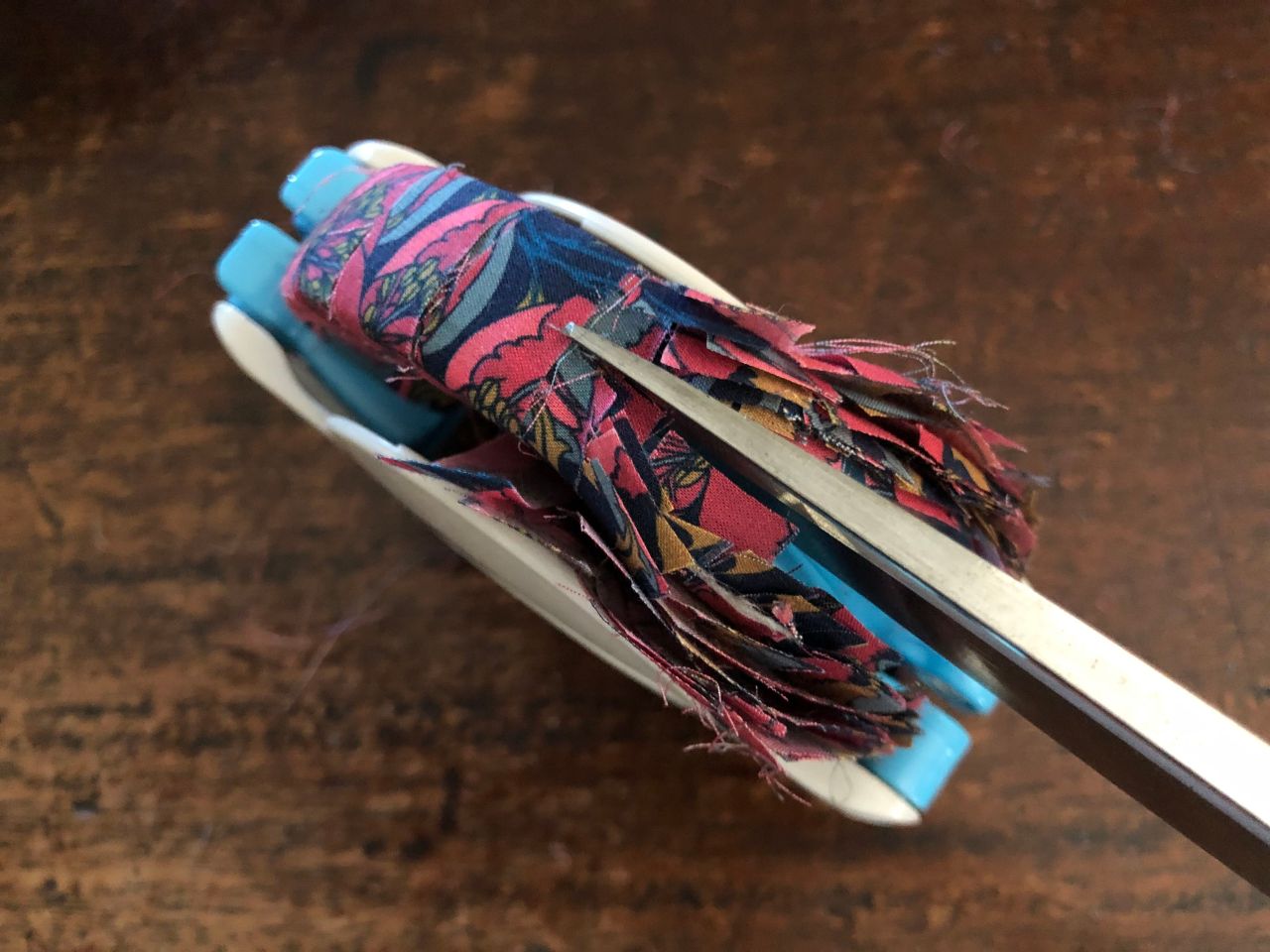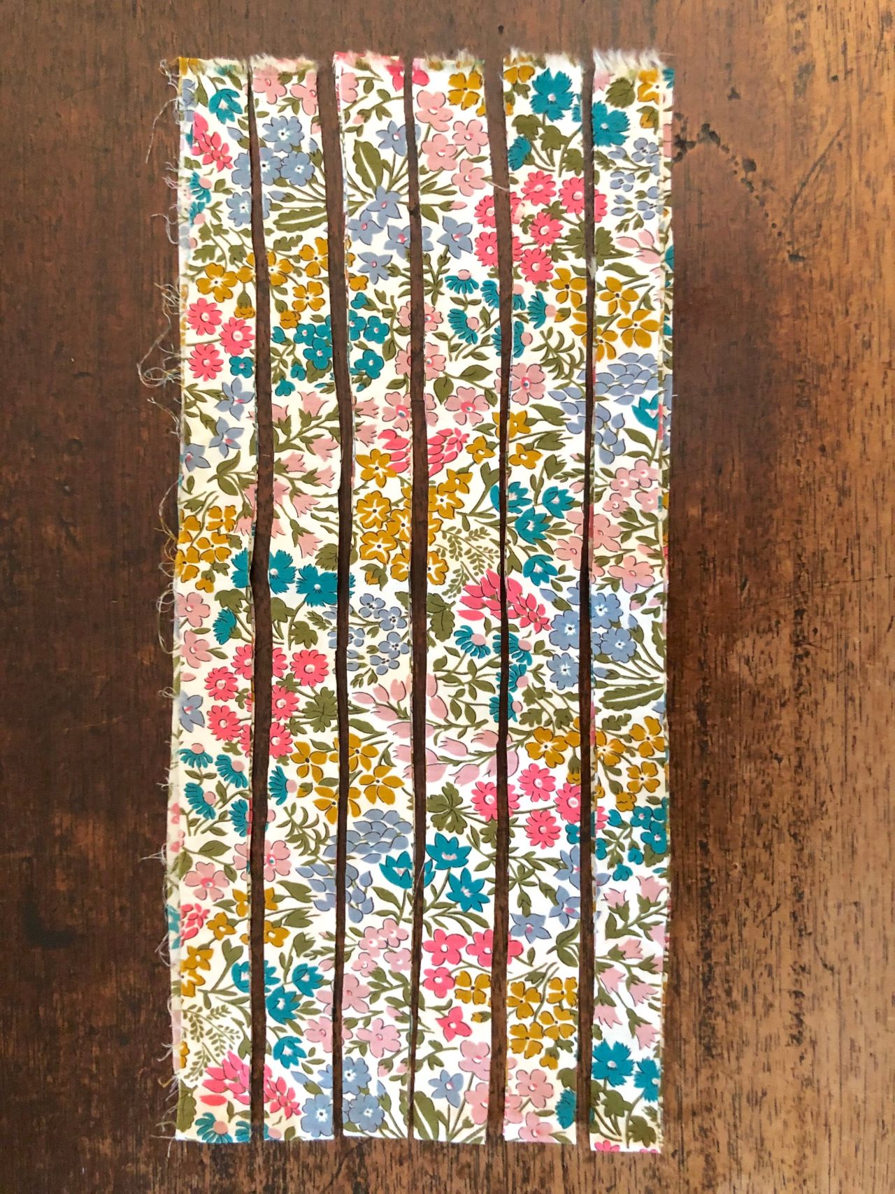 ※細めにカットする場合は生地の柄の大きいものや、規則的な柄など、色が分かり易いものを選んでみました。