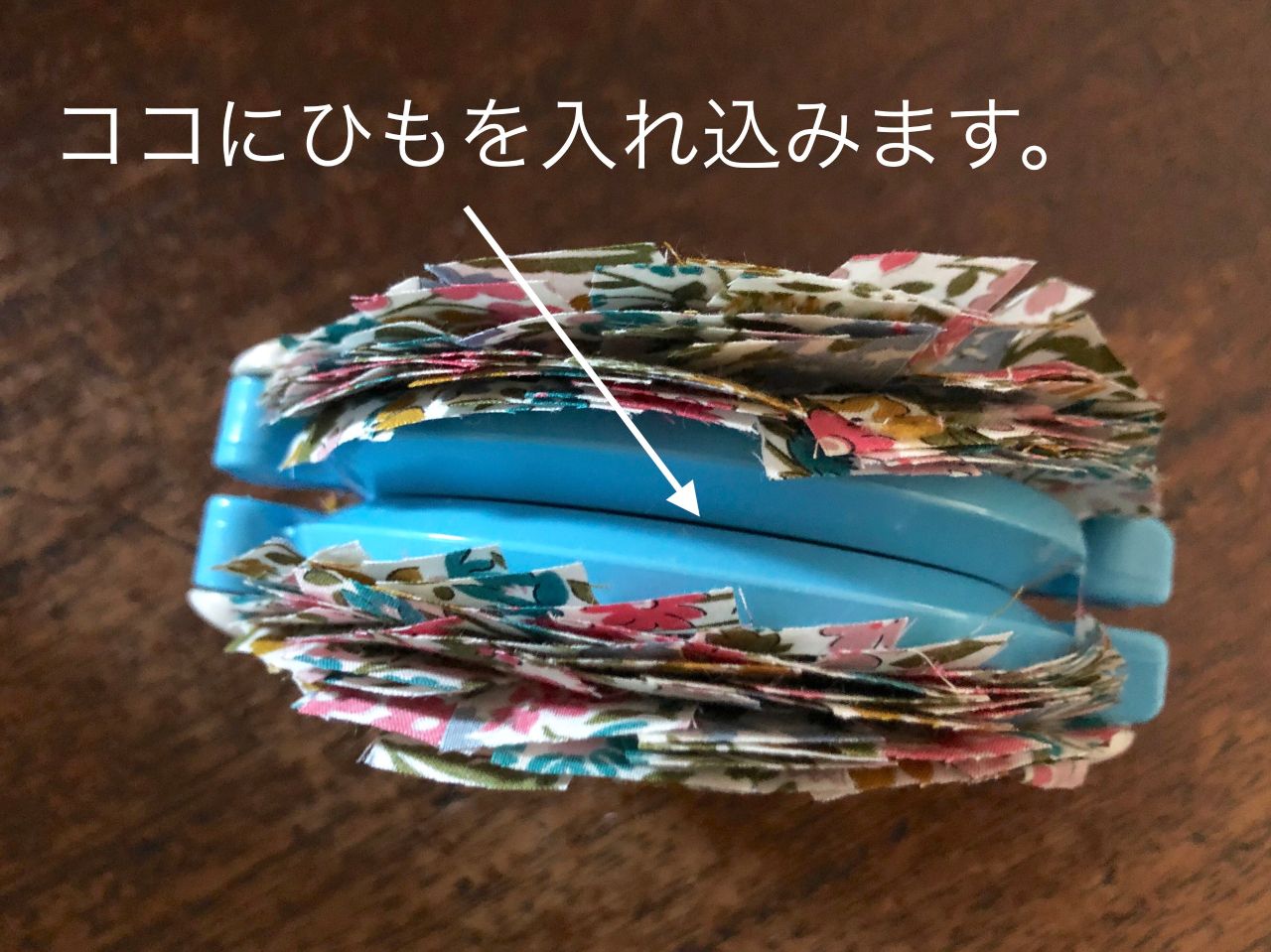 ④カットして見えてきた真ん中のところに、残しておいたひもを入れて結びます。