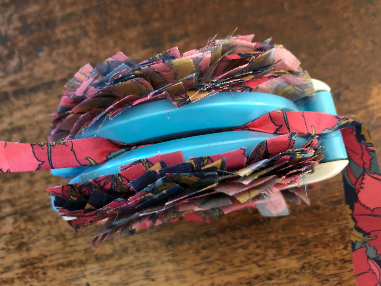 こちらは、同じ110cm幅×10cmを1cm前後にカットしてみました。9本に切り分けられたので、ポンポンメーカーに巻きつける分量も増えました‼︎