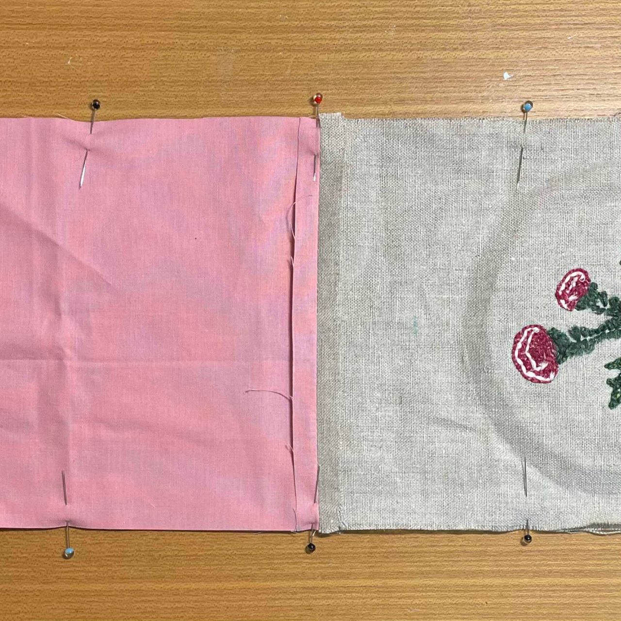 7.横の縫い代を揃えて、まち針で留める。開いた縫い代が片倒しにならないように注意!