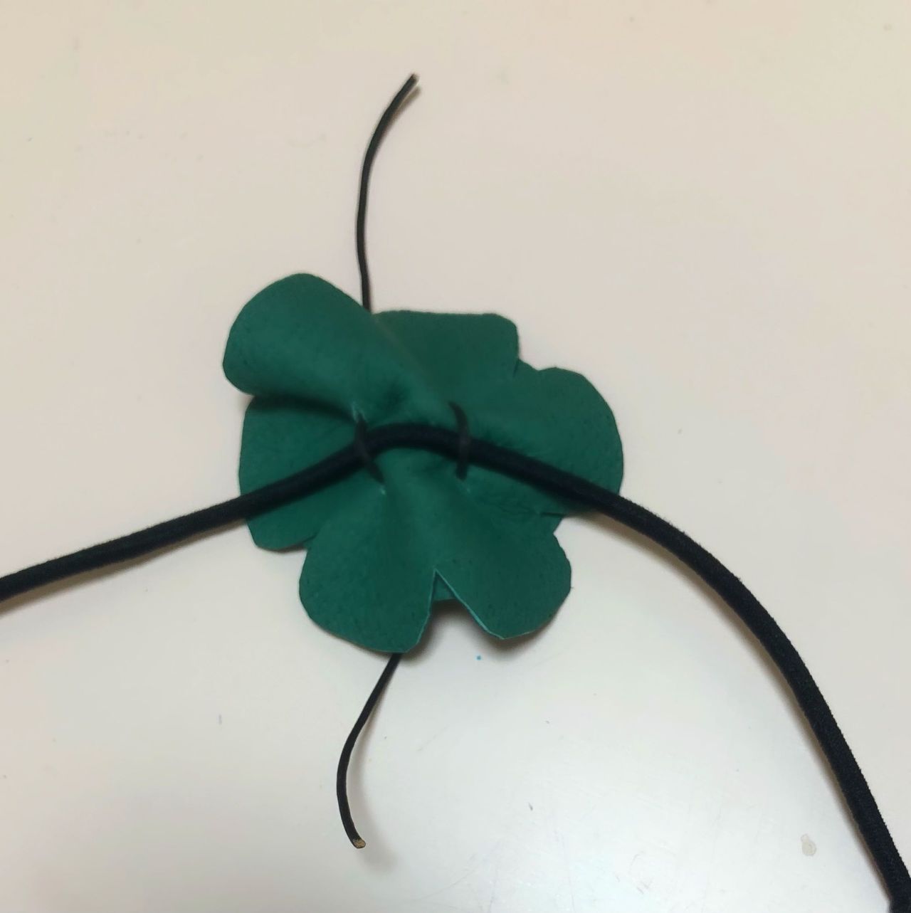 ・花びらをずらして3枚重ね、穴に順番に革紐を