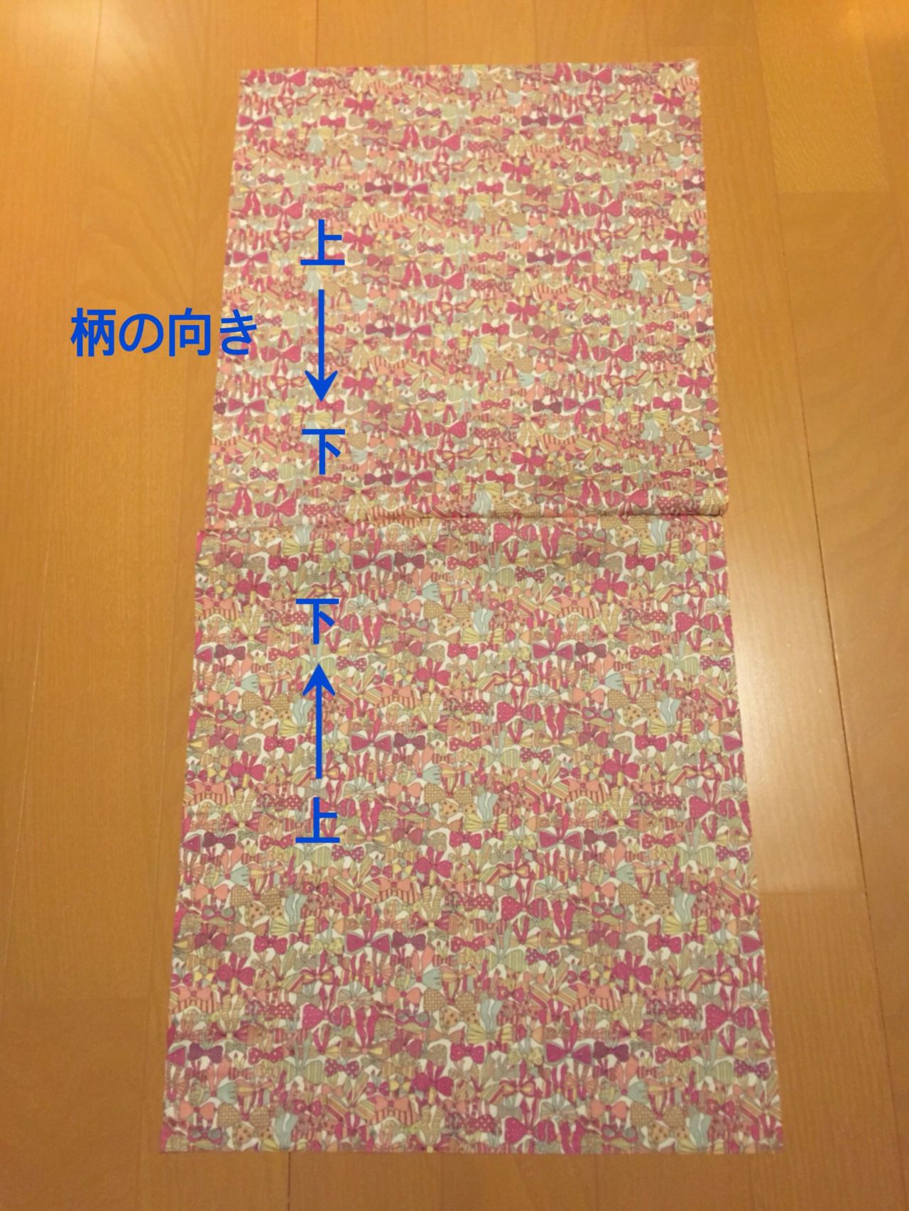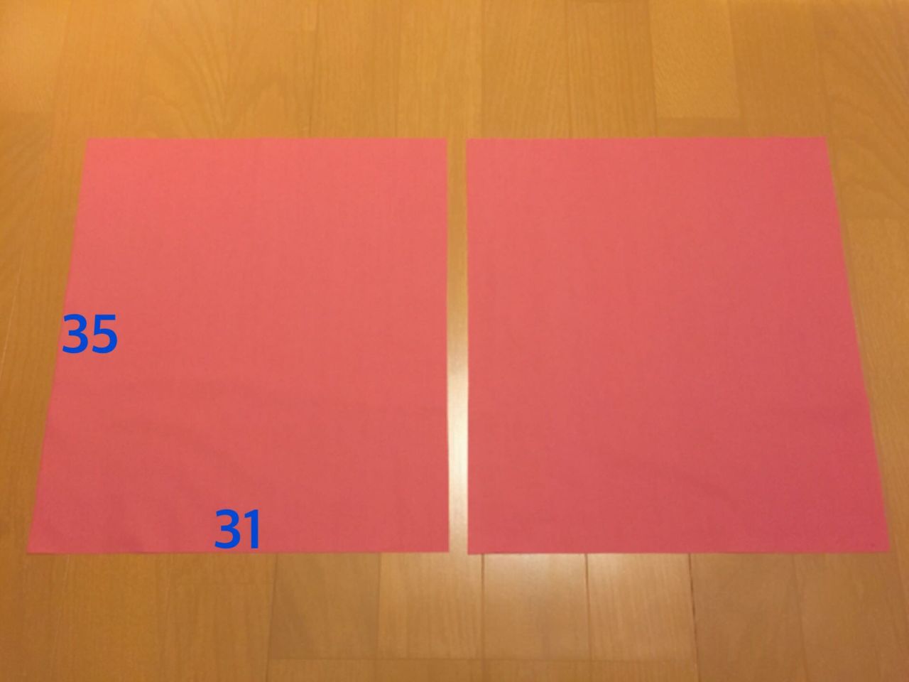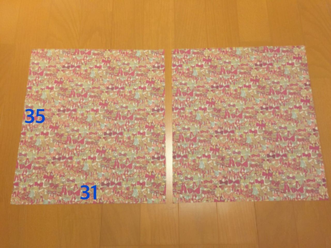 ①表生地、裏生地共にタテ35cm×ヨコ31cmにカット。これを2枚ずつ用意する。