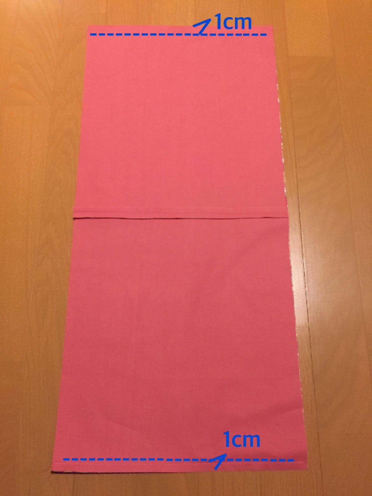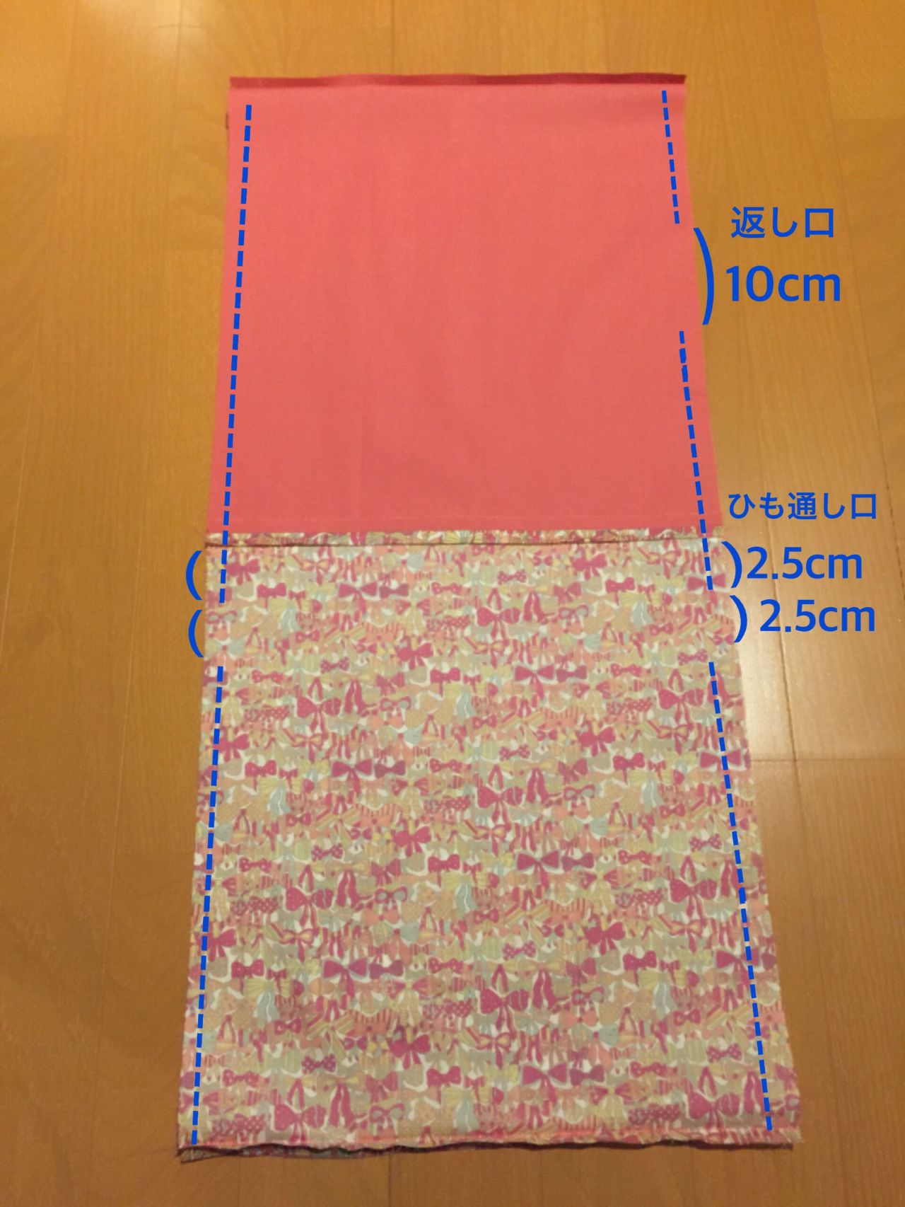 ⑤画像のようにたたみ直し、返し口、ひも通し口を残して縫い代1cmで縫い合わせる。縫い代はアイロンで割る。