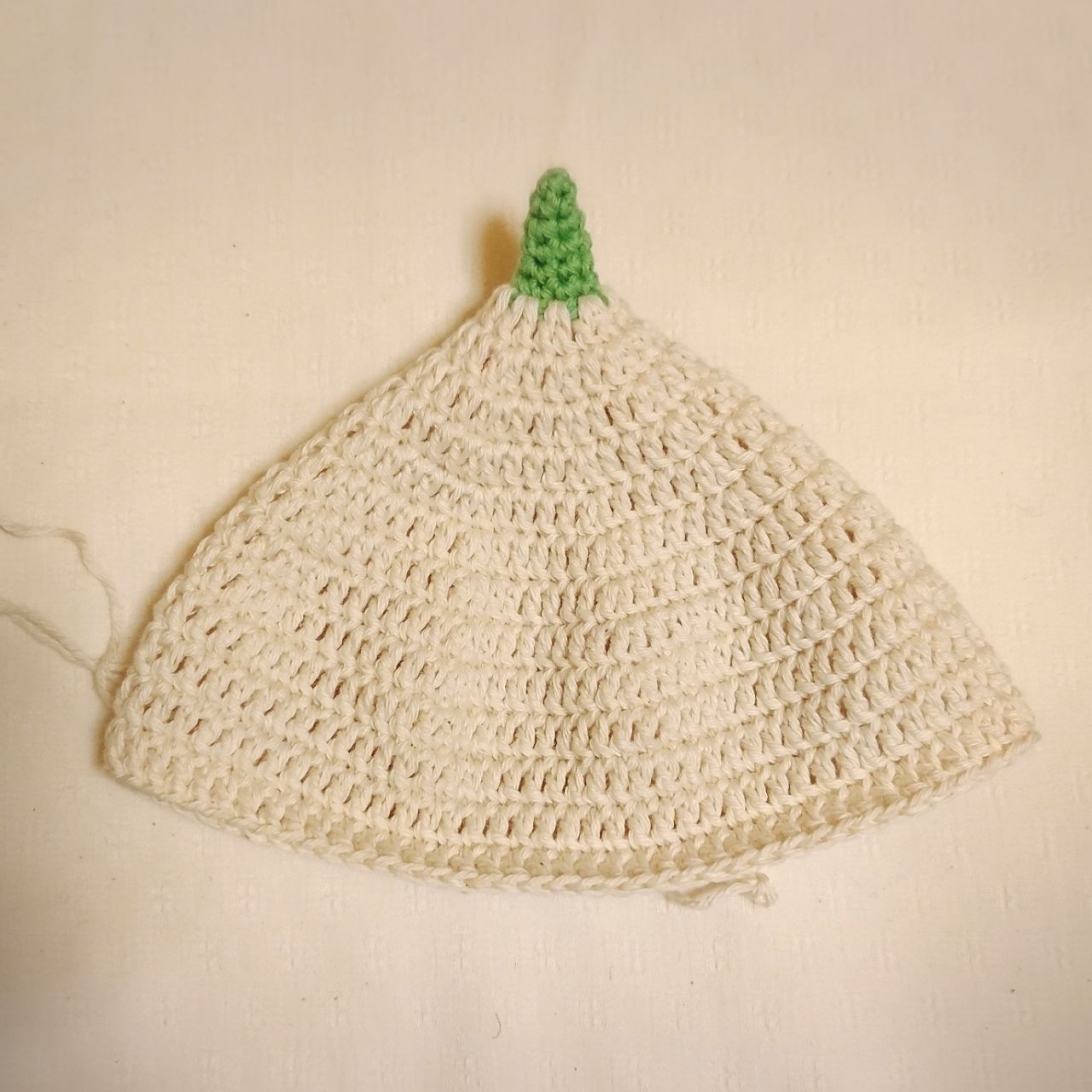 グリーンの糸で6段編んだら、キナリの糸に変えて編みます。