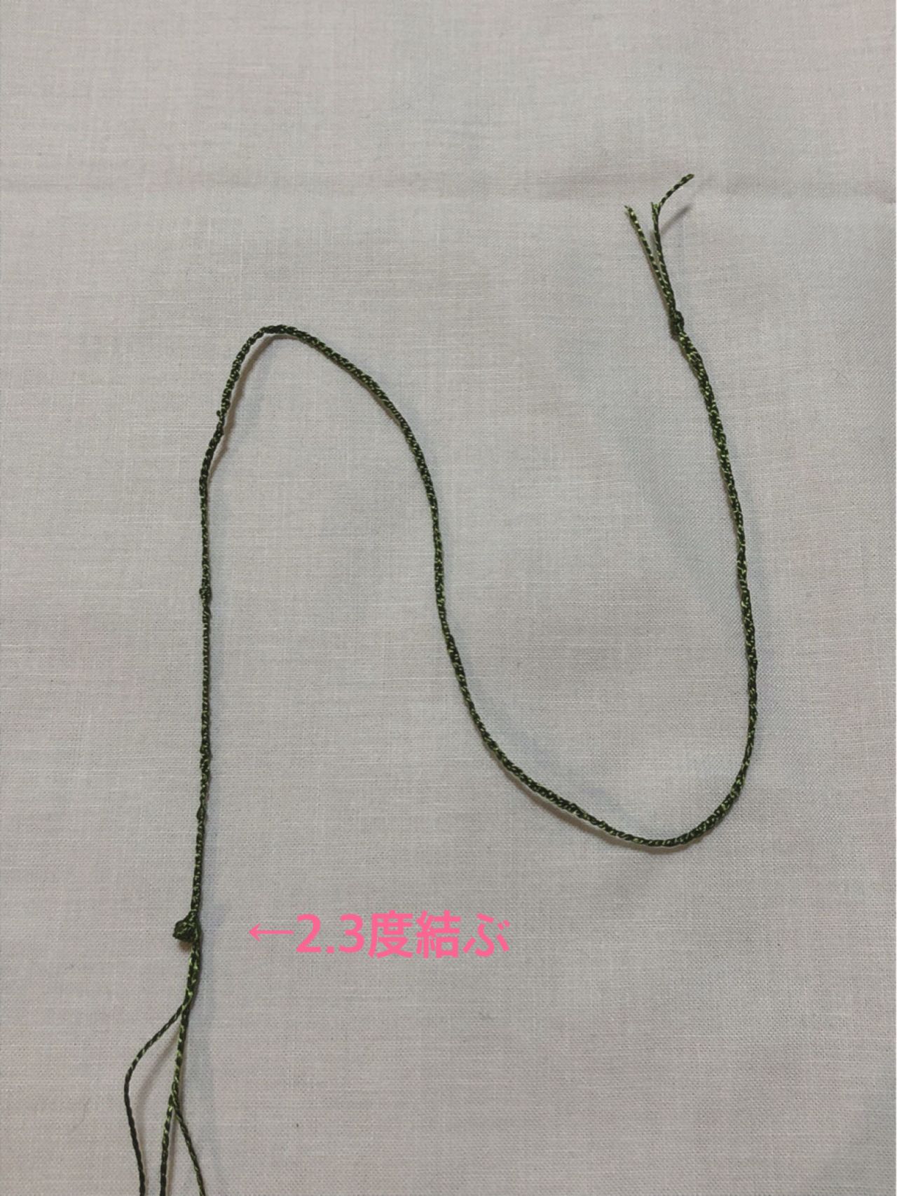 6.余った糸を20cmほどカットし、真ん中で縛ります