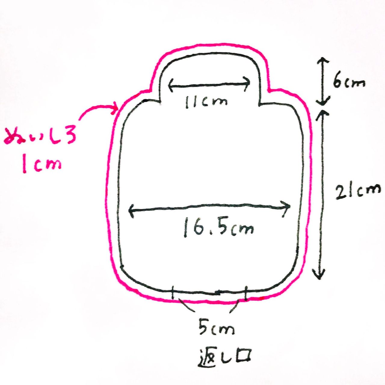 そして縫いやすくする為に、仕上がり線と返し口の印を書いておきましょう。