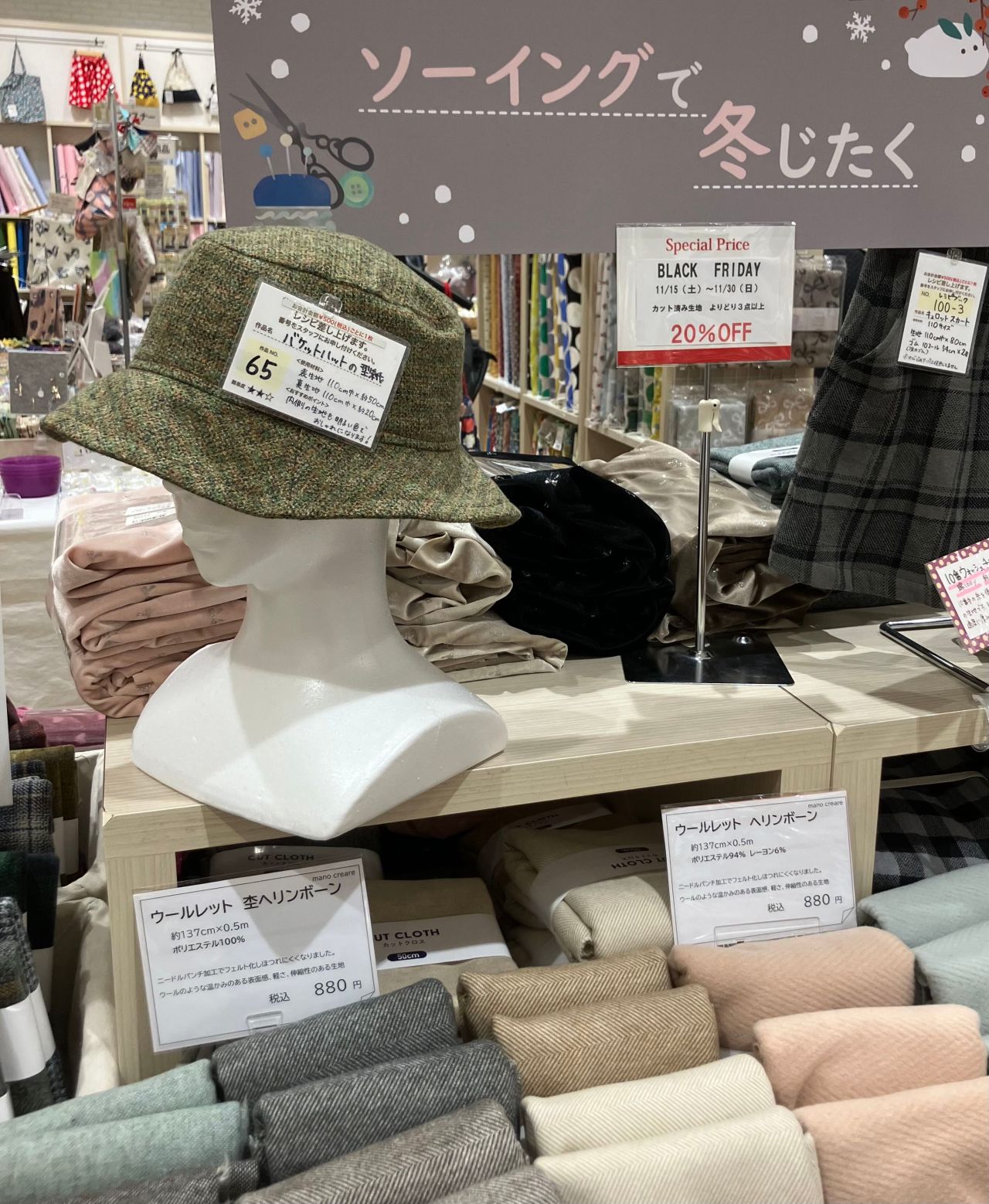 武蔵小杉店の店頭にはコットンツィードで作ったサンプル作品も飾っています。