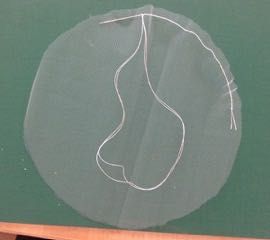 1チュールの端から5mmのところを一周ぐし縫いする。糸を切らずにチュールの上にボンテンを置く。