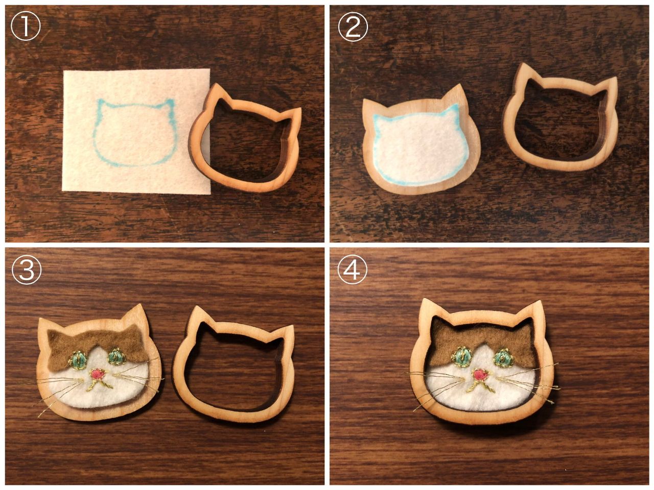 ③お好きな猫の顔をフェルトや刺しゅうで作ります。